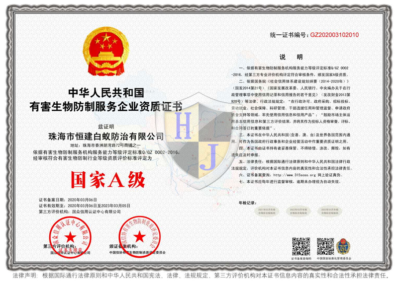 經多年專注誠信經營,公司獲得國家級有害生物防制A級資質證書、國家級消毒一級資質證書,通過廣東省病媒生物預防控制備案、市愛衛辦頒發病媒生物備案證明、廣東省守信用重合同企業榮譽、城市蟲害行業等多項資質。