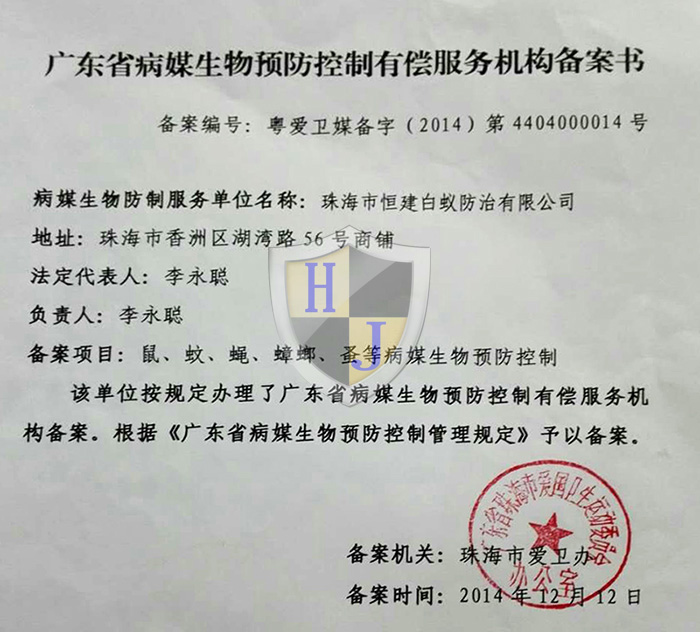 珠海市恒建白蟻防治有限公司成立于2005年10月,注冊資金人民幣300萬元,本地老牌公司。本公司專注于白蟻防治、滅鼠、殺蟲、疫情消毒防控、防蛇、其它有害生物病媒控制和預防管理等。